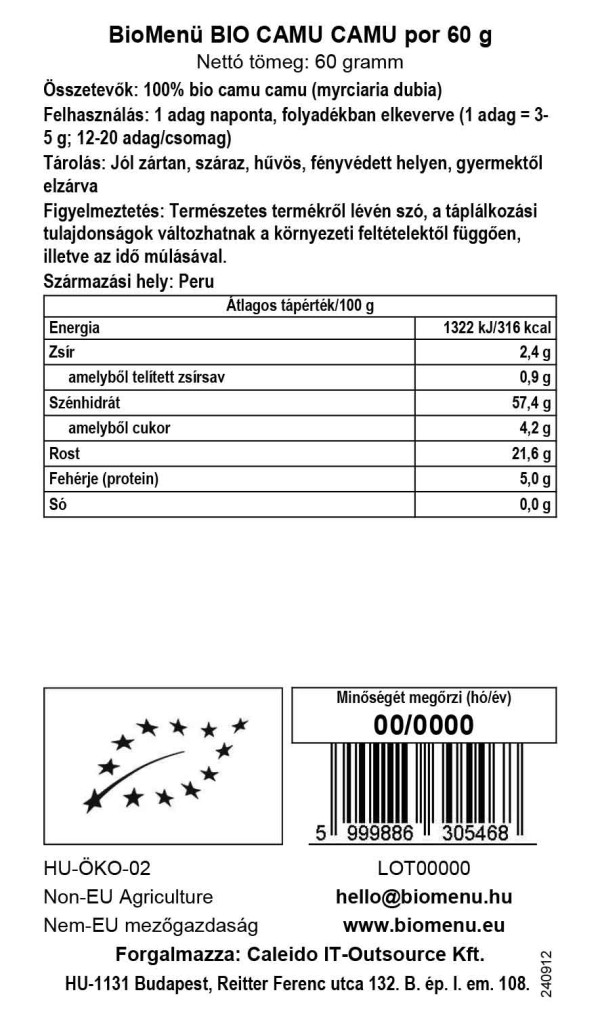 Organický prášok Camu camu spĺňa požiadavky uvedené v nariadení Rady (ES) č. 834/2007 (a následných zmenách). Spĺňa tiež prísne normy ekologického poľnohospodárstva Soil Association. Počas výrobného procesu nie sú produkt a obalové materiály vystavené pesticídom ani rezíduám pesticídov. Pesticídy sa neskladujú na mieste, ani sa nepoužívajú vo výrobných alebo skladovacích priestoroch.
