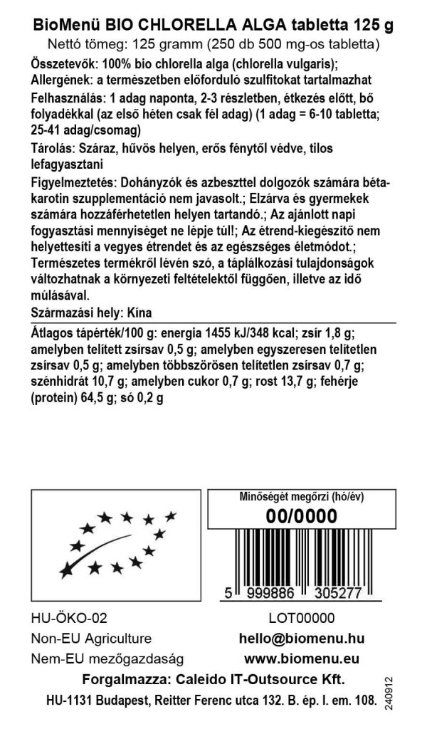 Organické tablety Chlorella spĺňajú požiadavky uvedené v nariadení Rady (ES) č. 834/2007 (a následných zmenách). Spĺňa tiež prísne normy ekologického poľnohospodárstva Soil Association. Počas výrobného procesu nie sú produkt a obalové materiály vystavené pesticídom ani rezíduám pesticídov. Pesticídy sa neskladujú na mieste, ani sa nepoužívajú vo výrobných alebo skladovacích priestoroch.