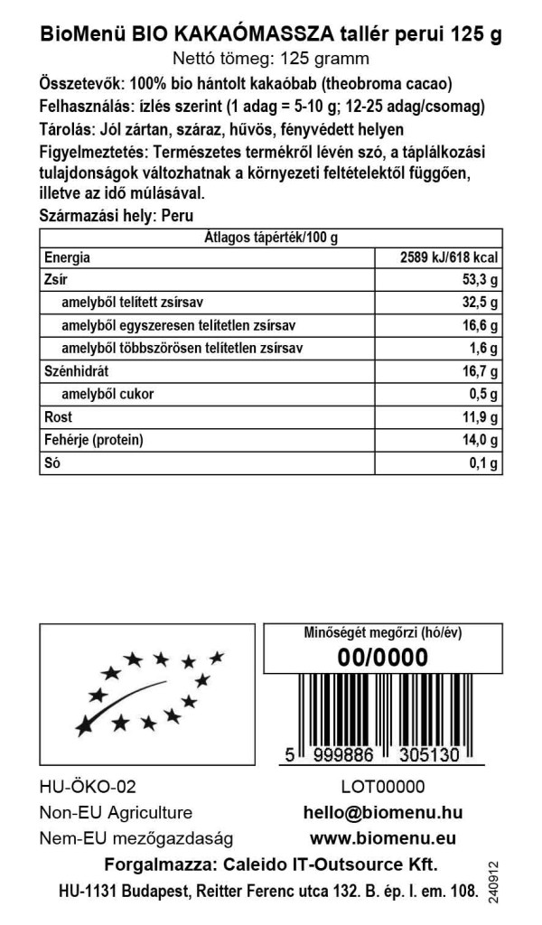 Tri druhy tuku nasýtené kakaovými antioxidantmi, ktoré tvoria 50 % jeho hmoty, nášmu telu neškodia a nezvyšujú cholesterol (kyselina olejová, stearová a palmitová), obsahujú aj niekoľko aminokyselín (tryptofán a arginín). Kakaová hmota je nielen najdôležitejšou surovinou na výrobu čokolády, ale aj jednou z najobľúbenejších potravín na svete. Peruánska BioMenü Cacao Massa Tallér je lahodná superpotravina.