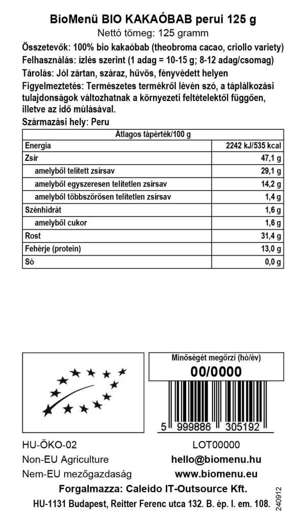 BioMenü Bio Cacao bôby sú vyrobené z kakaovej odrody criollo, ktorá je pre svoju vynikajúcu kvalitu nazývaná aj „kráľom“ kakaa. 50% hmotnosti kakaa tvoria tri druhy tukov, tie nášmu telu neškodia a nezvyšujú cholesterol (kyselina olejová, stearová a palmitová) a obsahuje aj niekoľko aminokyselín (tryptofán a arginín ). V surovej forme je veľmi zdravý, mimoriadne bohatý na antioxidačné flavonoidy.