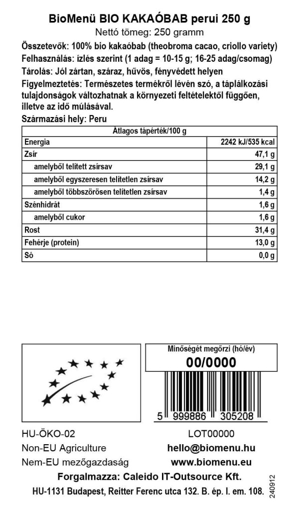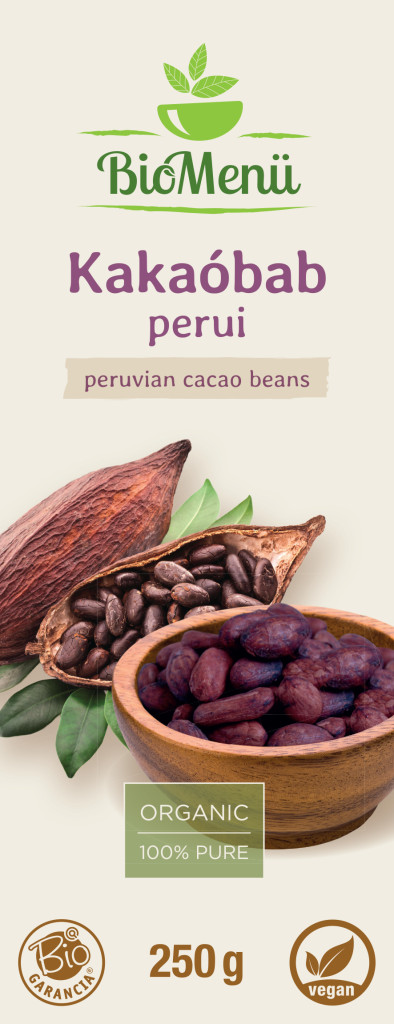 BioMenü Bio Cacao bôby sú vyrobené z kakaovej odrody criollo, ktorá je pre svoju vynikajúcu kvalitu nazývaná aj „kráľom“ kakaa. 50% hmotnosti kakaa tvoria tri druhy tukov, tie nášmu telu neškodia a nezvyšujú cholesterol (kyselina olejová, stearová a palmitová) a obsahuje aj niekoľko aminokyselín (tryptofán a arginín ). V surovej forme je veľmi zdravý, mimoriadne bohatý na antioxidačné flavonoidy.