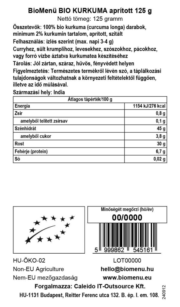 100% bio kúsky kurkumy (curcuma longa), minimálne 2% obsah kurkumínu, nasekané, preosiate