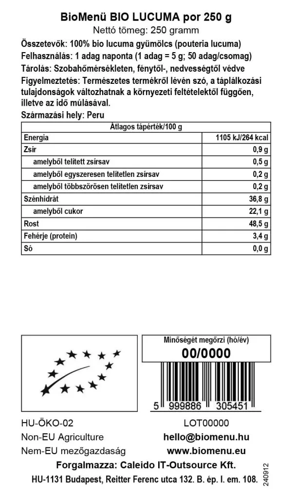 Organic Lucuma Powder je 100% prírodný a neobsahuje žiadne prídavné látky ako cukry, kyseliny, farbivá, konzervačné látky atď.