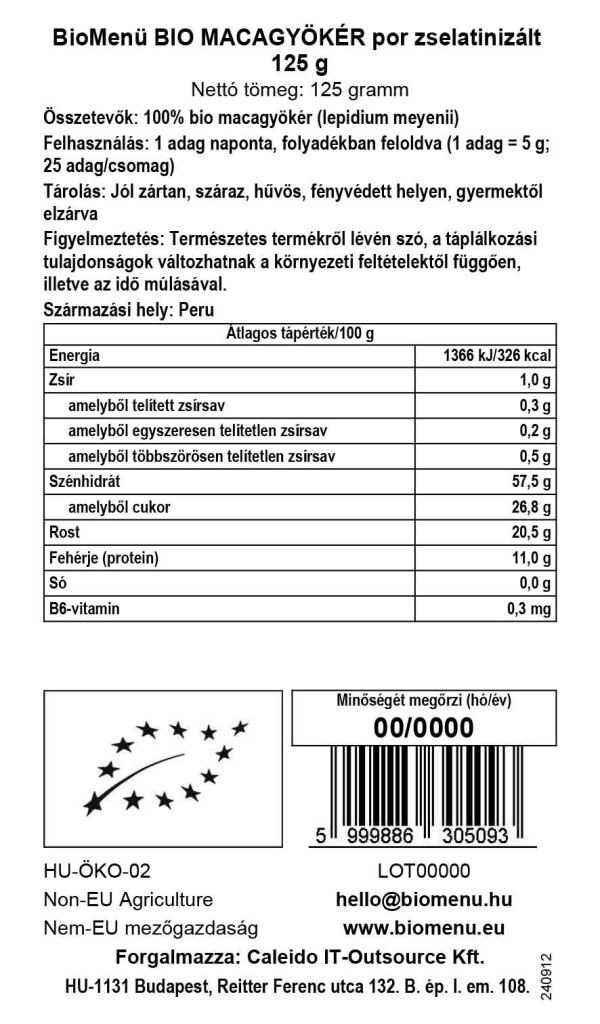 Organický prášok Maca spĺňa požiadavky uvedené v nariadení Rady (ES) č. 834/2007 (a následných zmenách). Spĺňa tiež prísne normy ekologického poľnohospodárstva Soil Association. Počas výrobného procesu nie sú produkt a obalové materiály vystavené pesticídom ani rezíduám pesticídov. Pesticídy sa neskladujú na mieste, ani sa nepoužívajú vo výrobných alebo skladovacích priestoroch.
