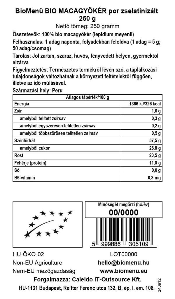 Organický prášok Maca spĺňa požiadavky uvedené v nariadení Rady (ES) č. 834/2007 (a následných zmenách). Spĺňa tiež prísne normy ekologického poľnohospodárstva Soil Association. Počas výrobného procesu nie sú produkt a obalové materiály vystavené pesticídom ani rezíduám pesticídov. Pesticídy sa neskladujú na mieste, ani sa nepoužívajú vo výrobných alebo skladovacích priestoroch.