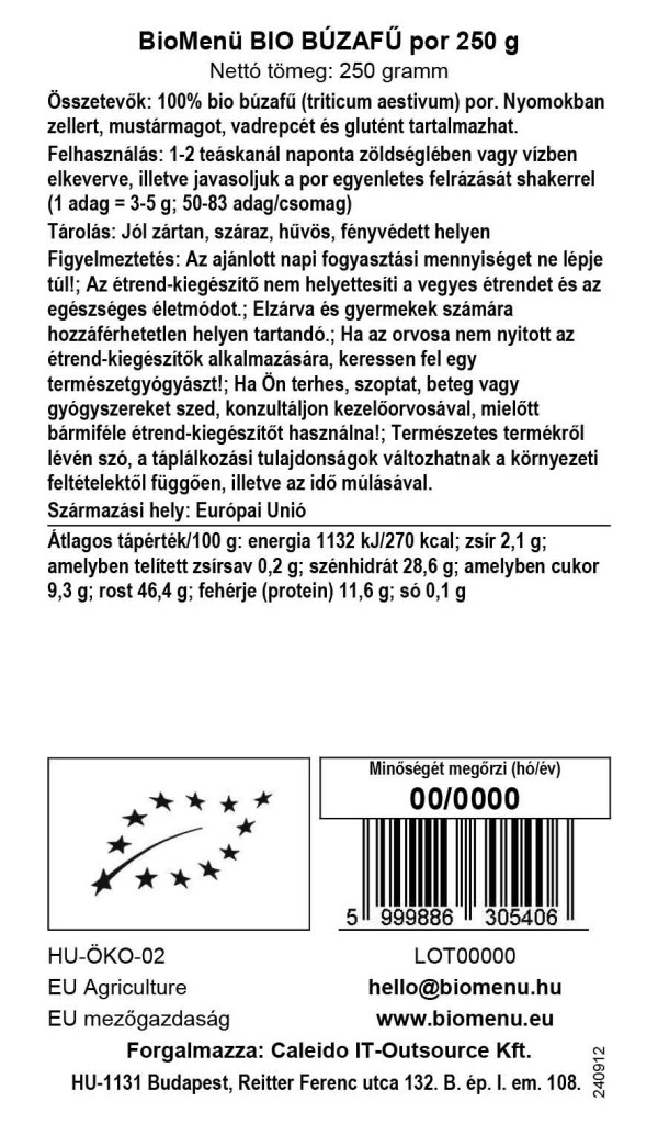 100% bio pšenica tráva (triticum aestivum) prášok. Môže obsahovať stopy zeleru, horčičných semien, voľne žijúcej repky a lepku.
