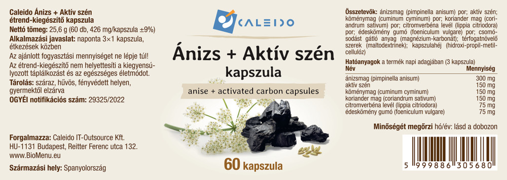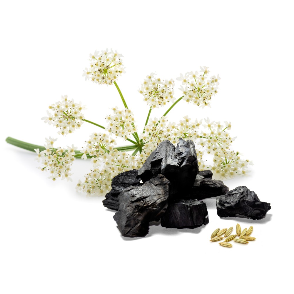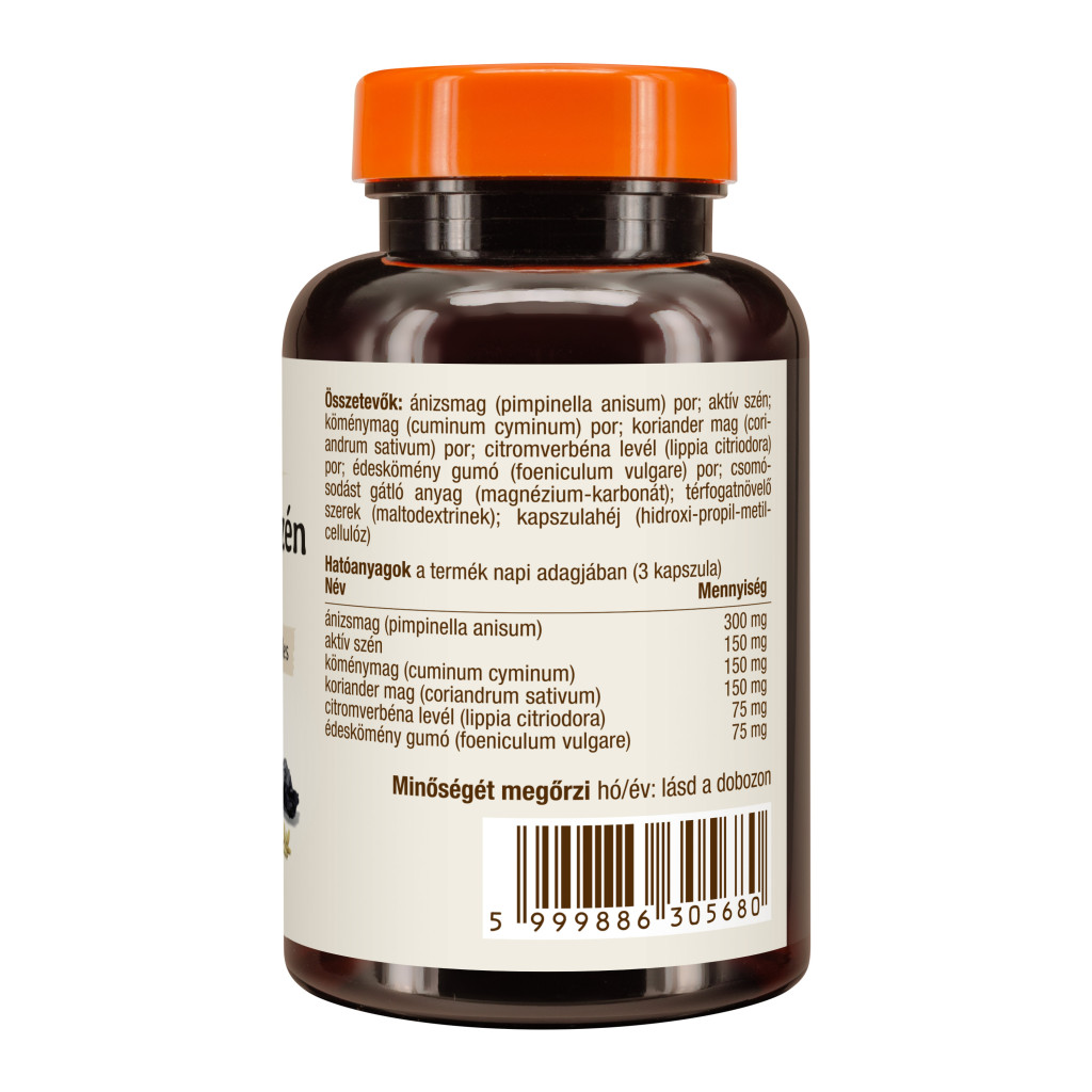 prášok zo semien anízu (pimpinella anisum); aktívne uhlie; prášok zo semien rasce (cuminum cyminum); prášok zo semien koriandra (coriandrum sativum); prášok z listov citrónovej trávy (lippia citriodora); prášok z hľuzy feniklu (foeniculum vulgare); protihrudkujúca látka (uhličitan horečnatý); objemové činidlá (maltodextríny); obal kapsuly (hydroxypropylmetylcelulóza)