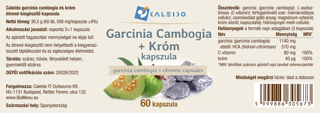 garcinia (garcinia cambogia); kyselina L-askorbová (vitamín C); objemové činidlo: mikrokryštalická celulóza; protihrudkujúca látka: stearan horečnatý; chlorid chrómový; obal kapsuly: hydroxypropylmetylcelulóza