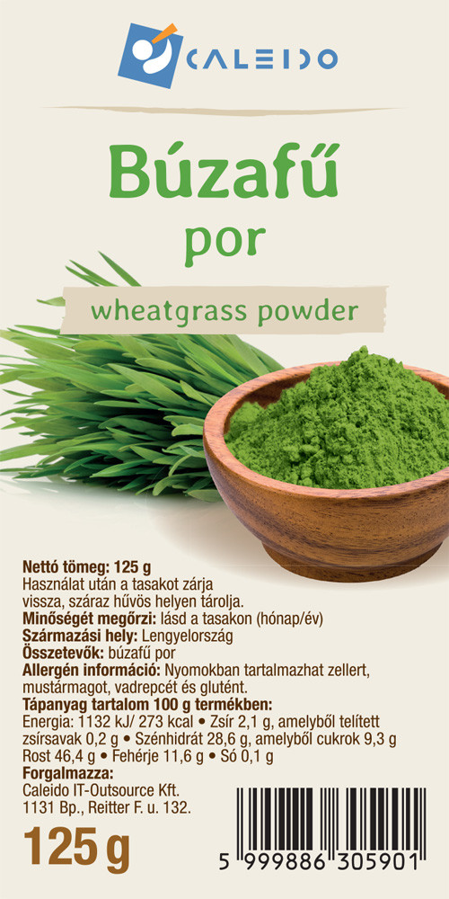 Prášok z pšeničnej trávy. Môže obsahovať stopy zeleru, horčičných semien, voľne žijúcej repky a lepku.